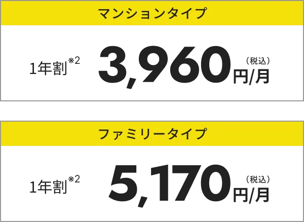 ※2 1年割は、1年間同一の「Moon光」契約を継続して利用することが条件となり、解約(定期契約のない料金プランへの変更含む)のお申出がない場合は自動更新となります。当該期間内での解約、定期契約のない料金プランへの変更などの場合、更新期間を除いて「Moon光 基本プラン」の場合、ファミリータイプ5,170円(税込)、マンションタイプ3,960円(税込)、「Moon光 高速プラン」の場合、ファミリー・マンションタイプともに6,160円(税込)の解約金がかかります。ただし、契約満了月の当月・翌月・翌々月はかかりません。