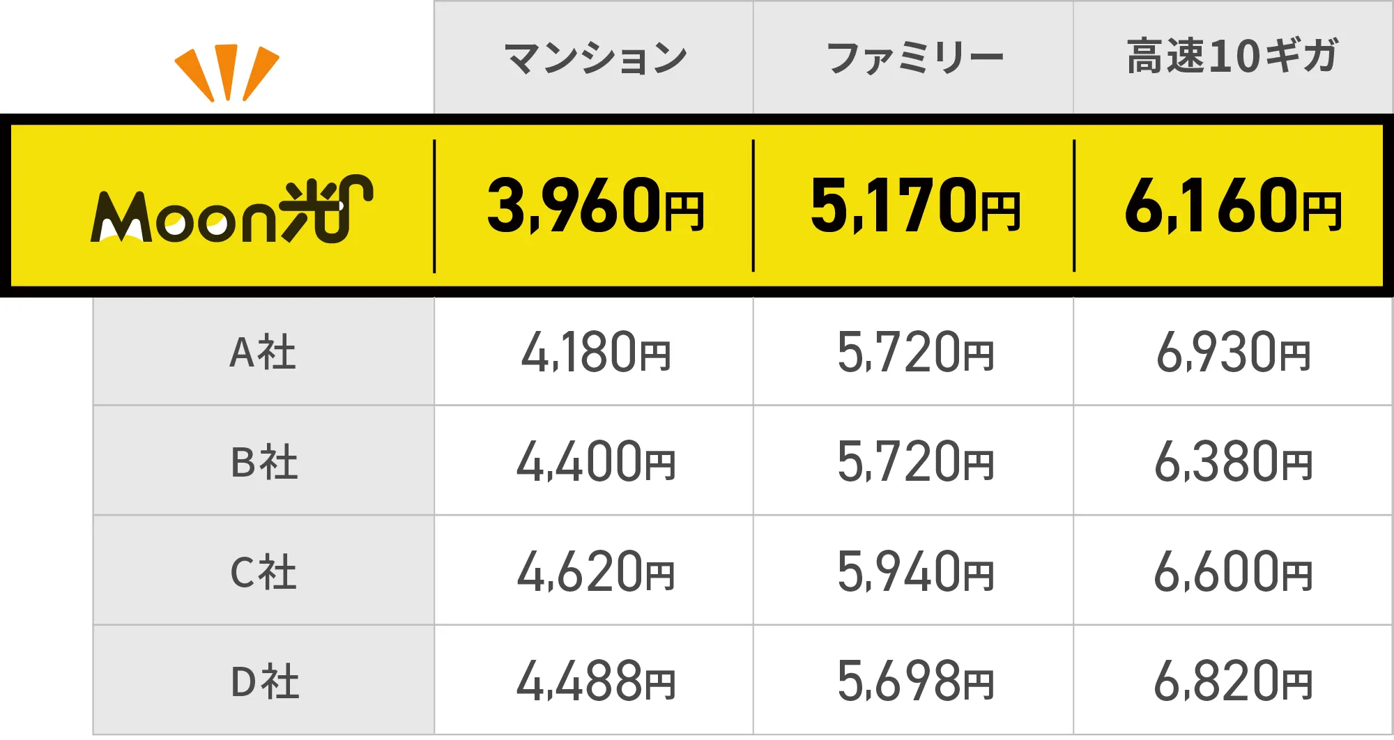 定期契約なしの場合、Moon光 基本プランマンションタイプ:4,478円(税込) /月、ファミリータイプ5,478円(税込)/月、Moon光 高速プラン(マンション・ファミリー共通):6,578円(税込) /月となります。
